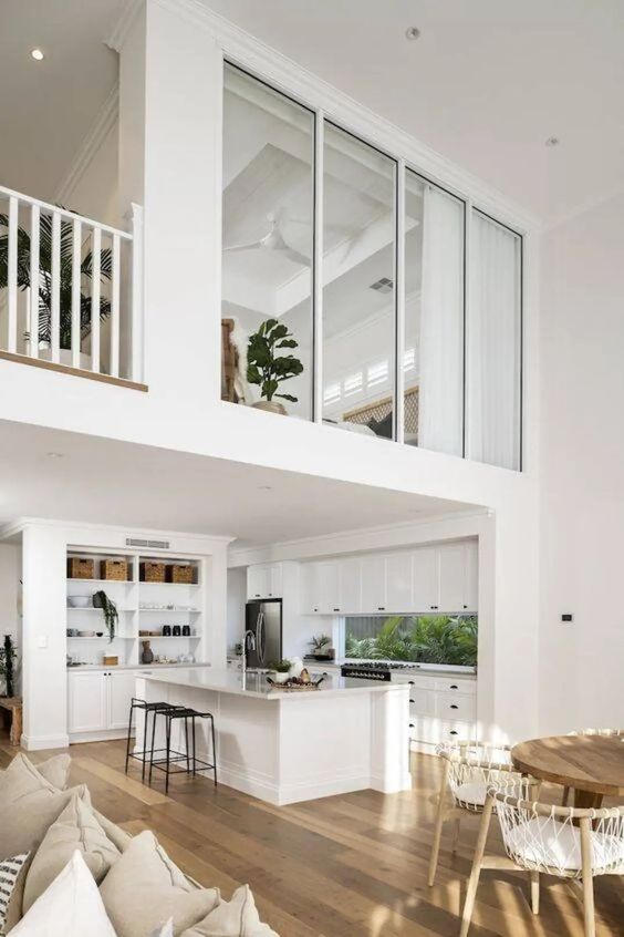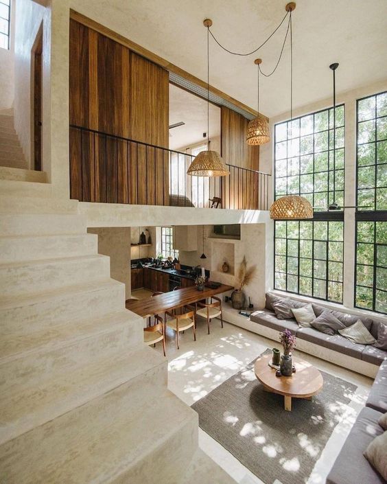 복층 인테리어의 주요 특징은 다양한 층 간의 연결과 상호 작용입니다. 계단, 갤러리, 혹은 중정과 같은 구조물이 사용되어 각 층이 서로 어떻게 연결되는지가 중요한 디자인 요소입니다.